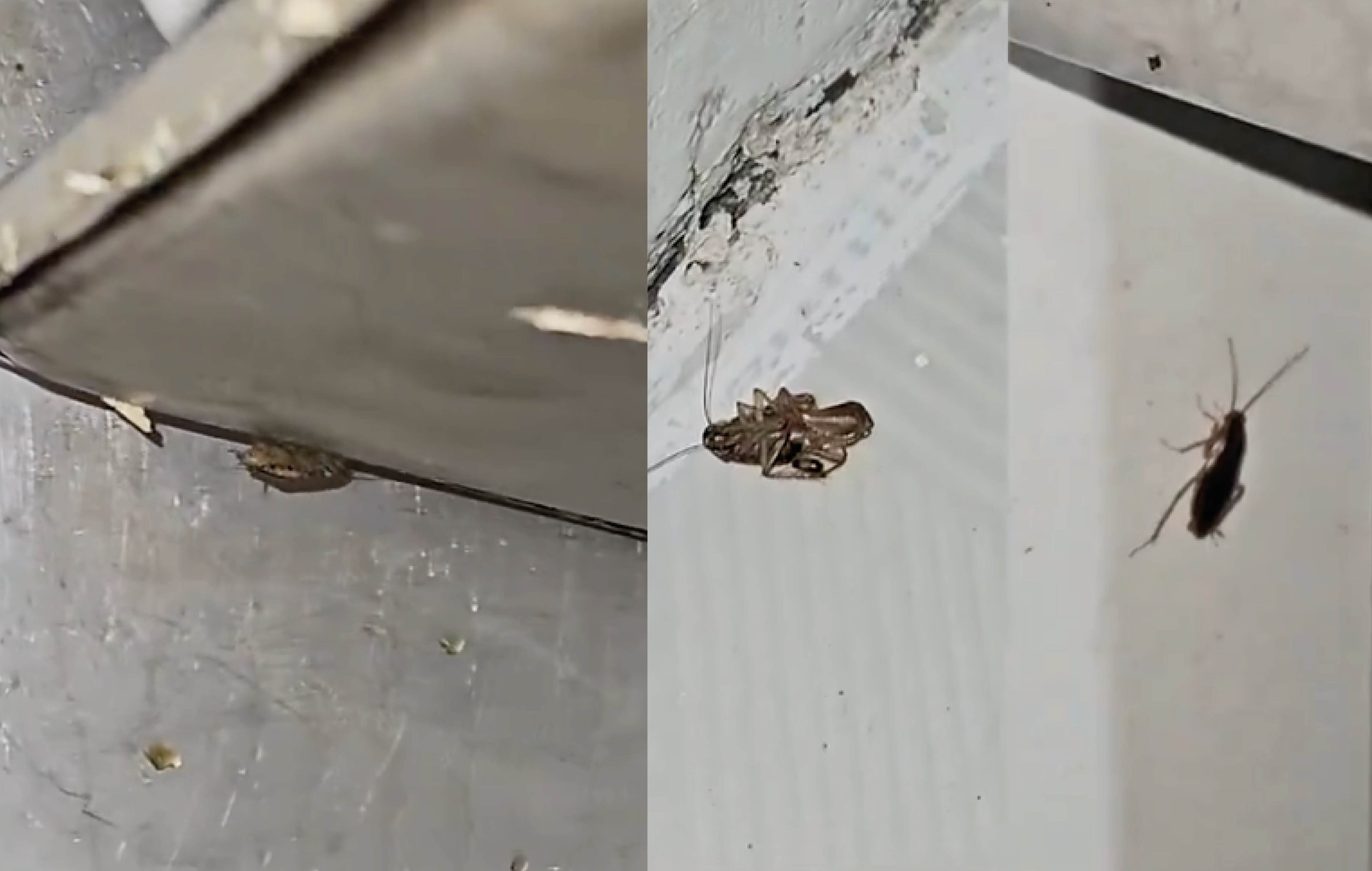 No vídeo, vemos baratas nas panelas, paredes e utensílios de cozinha. Além disso, há um manuseio inadequado dos alimentos para armazená-los.