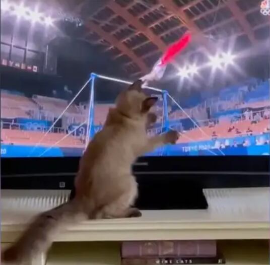 Uma coisa é certa: a ginástica olímpica é a modalidade favorita dos gatos. Quem sabe os bichanos não passem a representar seus países em uma oportunidade futura? Em um segundo ponto de vista, os gatinhos poderiam estar interessados em apenas capturar os ginastas mesmo.