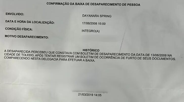 A delegada responsável pela Delegacia de Proteção à Pessoa da Polícia Civil do Paraná, Iara Dechiche, afirmou que casos como o de Dayanara são raros. Segundo ela, ao comparecer a uma delegacia ou ao Conselho Tutelar e informar o reaparecimento, o nome deve ser removido do sistema e um documento oficial entregue ao cidadão.