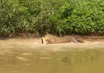 No vídeo, é possível ver a habilidade da onça ao atacar a presa, que não conseguiu terminar de devorar o peixe e se tornou o alimento do felino.