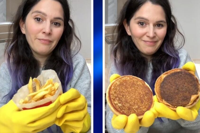 “Este é o famoso cheeseburger. Não se decompôs. Esta é a minha coisa favorita da rede. Estou com luvas porque estou fazendo a dramática. Aqui estão as batatas. Este é o combo e parece que comprei ontem.”
