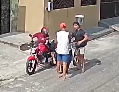 Como é possível ver no registro, enquanto um homem freia a moto e o outro tenta sair tranquilo, lá de longe vem um rapaz de bicicleta totalmente distraído e acaba causando o acidente.