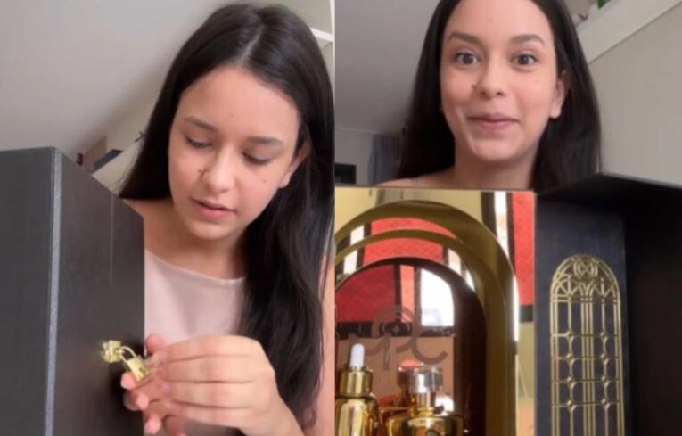 O material chegou em uma caixa personalizada, lacrada com um cadeado, e só pôde ser aberta com o auxílio de uma chave especial. Dentro, estavam um perfume, que a influenciadora acredita ser um lançamento da marca de Virgínia, e um sérum 10 em 1, ambos dispostos em um suporte elegante que realçou o requinte da apresentação.