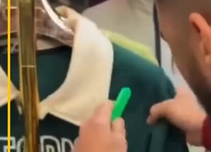 Em seguida, ele pega uma camisa da sua própria loja e, aparentemente, tenta repetir o teste.
