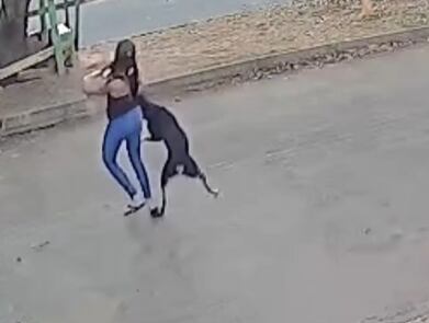 No registro, captado por uma câmera de segurança, o animal raivoso tenta de todas as formas abocanhá-los, e a mulher se esquiva das investidas.