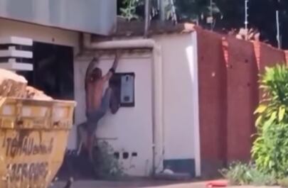 Como é possível ver no flagrante, o homem sobe no muro que estava próximo da fiação e acaba esmagando a cerca elétrica da residência sem medo de se eletrocutar, mas não sabia que o pior ainda estava por vir.