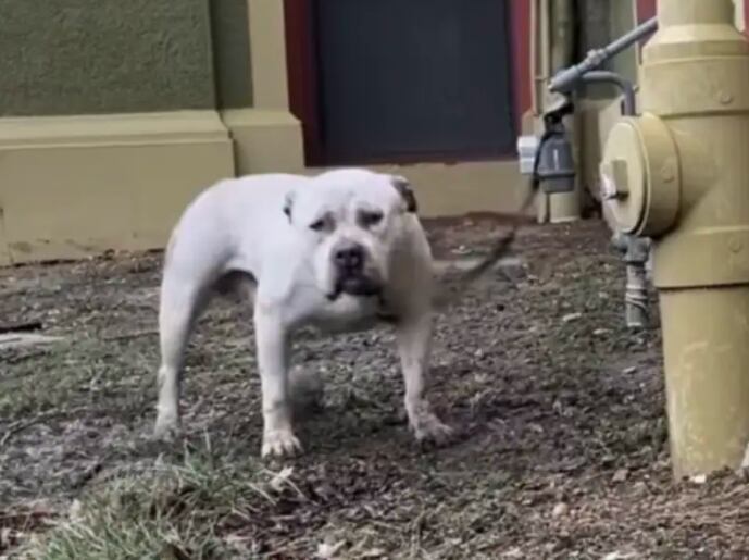 “Amarrado a um metro em um parque e deixado para trás em um dia muito chuvoso, lamacento e frio. Recebemos ligações dizendo que ele estava lá por um tempo, com uma guia curta, sem saber o que fazer consigo mesmo. Claro que ele parece intimidador. Ele é enorme e late para nós quando nos aproximamos. Mas no momento em que ele sabe que está seguro e que seremos nada além de legais com ele... basta olhar para seu grande e velho rosto feliz!”, diz uma publicação nas redes sociais.
