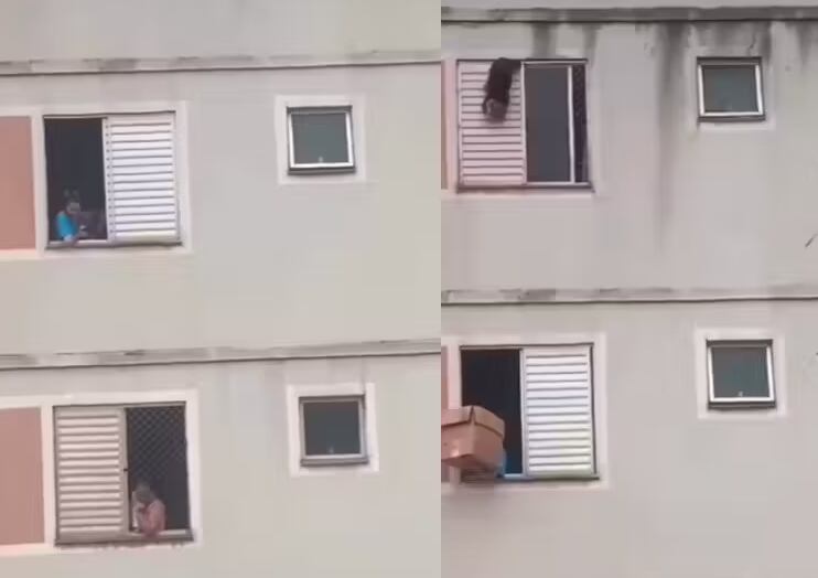 Nas imagens compartilhadas pelo @guarulhosonline, é possível ver o desespero do animal ao tentar se equilibrar na borda da janela. Sem apoio suficiente, ele acaba escorregando e despenca em queda livre. No entanto, a moradora já estava preparada com a caixa posicionada para amortecer o impacto.