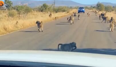 Como é possível ver no registro, do nada, o felino surge, tentando se aproximar rapidamente do grupo de babuínos que brincava na estrada. No entanto, o que parecia ser uma caça bem planejada rapidamente se transformou em um cenário caótico.