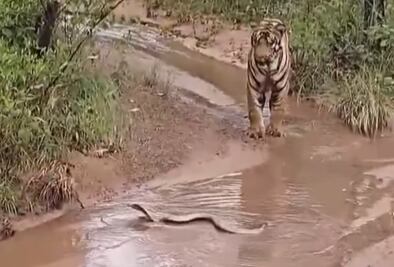 Como é possível ver nas imagens compartilhadas nas redes sociais, o tigre, ao se deparar com a serpente, decide recuar e evitar o perigo em vez de enfrentá-lo.